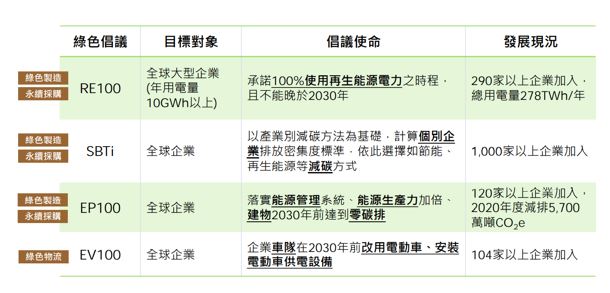 資料來源:RE100、SBTi、EV100、EP100;資策會 MIC 整理 (2021/09)