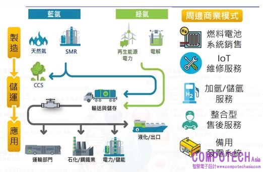 她透露,台灣製氫供應商以化石燃料產業副產氫為主,主要供應化工、煉油、煉鋼業等之純氫需求;儲運方式分為高壓儲氫、液態儲氫、有機儲氫等,多服務利基高價市場;燃料電池的元件供應鏈相對完整,惟質子交換膜燃料電池 (PEMFC) 關鍵元件尚待開發,固態氧化物燃料電池 (SOFC) 技術亦仍在研發測試階段,系統整合能力待培養。台灣已有燃料電池貨車之開發計畫,燃料電池電力備援系統亦於試點導入,投入廠商包括:中興電工、聯合再生、台達電等,基地台亦可利用燃料電池作為備援電力。
