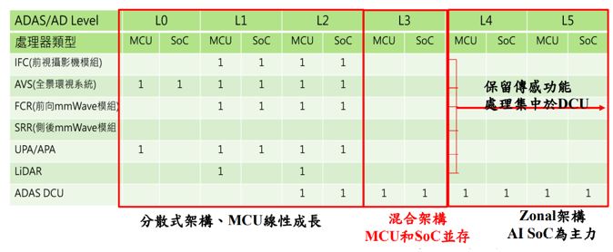 至於 L3 是否統包?何心宇回答:視車廠態度而定。特斯拉以 FSD (Full Self Driving,全自動輔助駕駛系統) 取代多個 MCU,但奧迪 (Audi) A8 卻是在 L2 基礎上堆疊一個 DCU,採 MCU+SoC 並存的混合架構。要大量取代 MCU 須在 L4 以上,屆時處理將集中於 DCU。簡言之,L0-L2 分散式架構仍是主流,MCU 數量隨著 ADAS 滲透率上升而成長;L2 及其以上整車廠還是保留分散式架構計算冗餘,額外追加 DCU 或 SoC 實現 L3 及其以上功能,處理晶片將線性成長;L4 及其以上將走向 Zonal、減少 MCU,增加 AI SoC 域控制實現感測器融合。