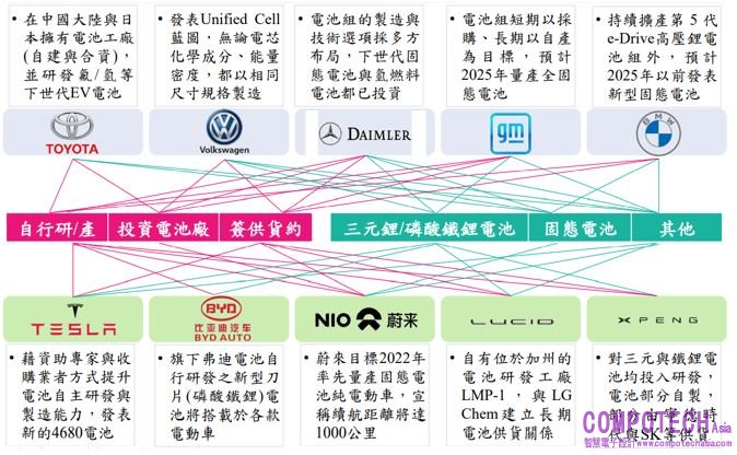 蘇奕霖指出,特斯拉與福斯 (Volkswagen) 等品牌大廠認為:電池成本若能下修至60 美元/kWh,電動車的總成本將有機會低於燃油汽車。特斯拉很早就注重電池佈局,擬於 2023 年推出的 Model2 有機會將電池成本降至 80 美元以下 (整車目標售價 2.5 萬美元)。車廠重金投入電動車電池,儘管策略不一、但不具排他性,暗示電池標準 (未統一) 與方案 (電芯、電池組設計、電池管理系統的三電整合) 仍有極大優化空間與商機。在電池種類上,固態電池電容量大、重量輕、充電速度快、續航力強、安全性高、壽命長等指標較液態電池表現佳。