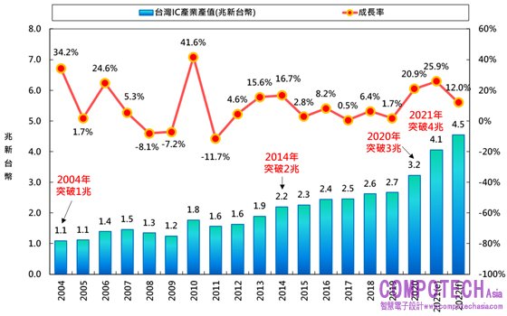 圖:2004年至2022年臺灣IC產業成長趨勢 資料來源:工研院產科國際所