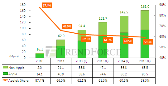 2010~2015平板市場總量與iPad占比預估