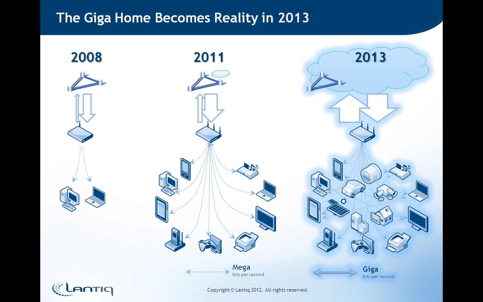 Lantiq公司執行長Christian Wolff表示:直到最近,使用者在家裡還是只能將有限的裝置連接在一起,像是個人電腦或筆記型電腦。在今天,居家網路所要承受的是越來越多的裝置。各種平板電腦、智慧型手機、機上盒(STB:set-top-boxes),以及新世代的顯示器與電視機,彼此都需要連結起來,並分享彼此的資料和多媒體高畫質串流影音。這種不斷增長的頻寬需求已經使得Giga Home的環境逐漸浮上檯面,而在電信系統業者和像是Lantiq這樣的晶片廠商攜手努力下,我們相信居家網路環境進入十億位元速度時代的美夢將在二○一三年成真。