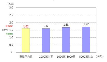 分析受訪企業資本額,發現不論資本額大小,受訪企業多數正面看待Q2景氣。其中,資本額高於5000萬美元的大型企業其CEI指數為1.72,資本額為1000萬-5000萬美元的中大型企業則為1.68,兩者皆高於整體平均值。