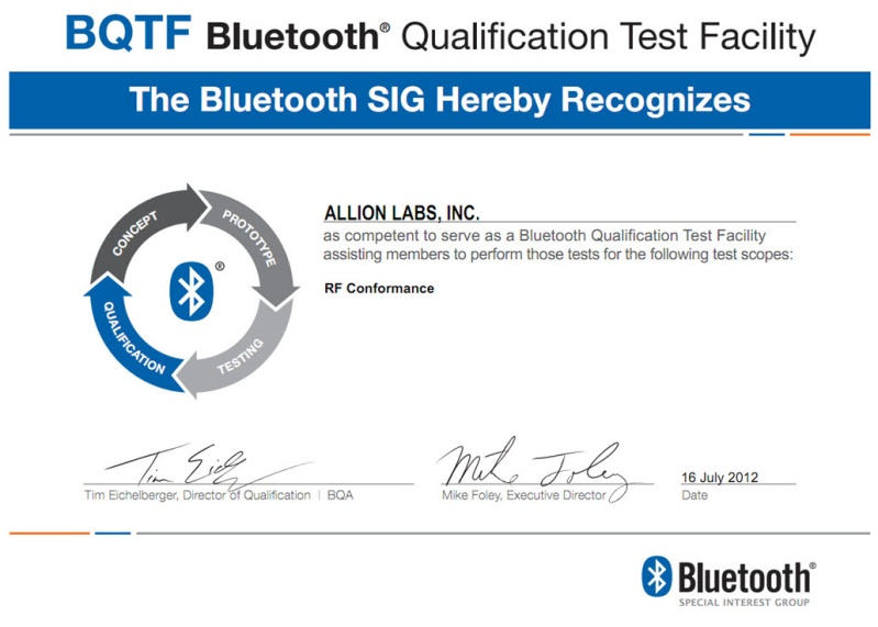 百佳泰(Allion Labs, Inc.)正式宣佈通過藍牙技術聯盟(Bluetooth Special Interest Group,SIG)授權,成為其官方認可的藍牙認證測試實驗室(Bluetooth Qualification Testing Facility,BQTF),提供藍牙技術標準認證服務。這是百佳泰繼資深技術專家成為BQE(Bluetooth Qualification Expert)之後,再一次將藍牙認證技術進行革命性的進階與升級。即日起,百佳泰將推出更全面性的藍牙認證與諮詢服務,從藍牙技術規格的測試評估、測試計劃擬訂、實際認證測試、問題偵錯、結果審查到登錄於認證列表,以提供廠商最一貫化的專業技術諮詢與認證測試執行服務。