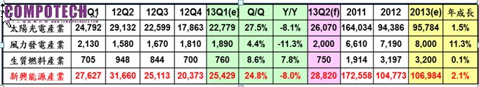 太陽光電方面,由於2012年價格跌幅過大,因此雖然景氣回升,但產值提升幅度有限,除非產業鏈價格能夠隨之高漲,否則全年產值仍會在一千億上下;此外,德國將於九月進行大選,目前對於太陽光電政策與產業態度為維持先前做法,然九月之後將視選舉結果而產生搶裝潮或緩裝現象;估計全年約新台幣957.8億元左右。