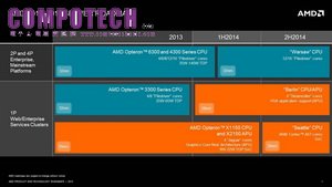 此外,AMD也揭示2014年伺服器產品的細節,其中包括頂級APU、雙插槽與四插槽CPU,以及預料將成為業界頂尖產品的ARM伺服器處理器的細節。不久之前,AMD剛宣布全面供應代號為「京都」(Kyoto)的AMD Opteron™ X系列處理器,其在所有效能量測程式所測得的分數,於小核心數伺服器市場中全面領先對手。這些即將推出的AMD Opteron™處理器將為快速變遷的運算市場帶來重要創新,其中包括整合CPU與GPU運算(APU),能支援資料中心高密度運算的高核心數ARM伺服器,以及每瓦、每元運算效能的大幅提升,和持有成本的降低。