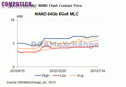 2013年7月16日--根據全球市場研究機構TrendForce旗下記憶體儲存事業處DRAMeXchange調查顯示,7月上旬OEM和通路端需求力道同時趨緩,NAND Flash合約價持平開出。由於系統OEM客戶對於第三季的銷售預期轉趨保守,新產品的備貨需求強度未如預期,加上多數廠商庫存皆已攀升至安全水位,因此整體拉貨意願轉趨觀望。雖然NAND Flash市場整體供給量在NAND Flash原廠調控產出下,與上季相比並未呈現大幅成長,但在買方對後市銷售看法保守下,合約價走勢仍是持平。
