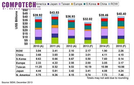 2013年12月4日--根據SEMI最新年終預測,2013年全球半導體製造設備市場營收將達320億美元,年減13.3%,台灣則是逆勢成長7%。2014年全球半導體設備市場榮景可期,除了其他地區(ROW)外,全球可望成長23.2%,而台灣的半導體設備資本支出則將連續四年蟬聯第一。全球半導體製造設備市場成長勢頭將延續至 2015年,預計成長率為2.4%,包括日本、歐洲、韓國、中國和其他地區皆有積極增長力道。