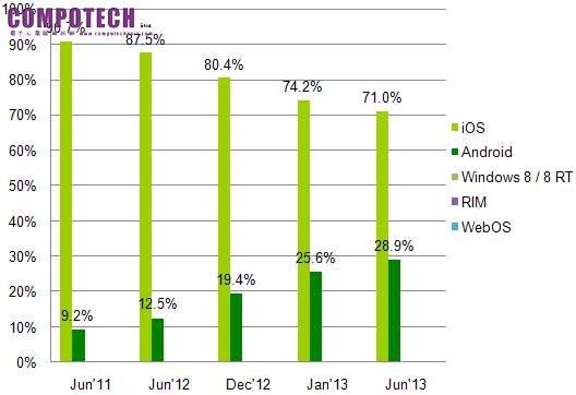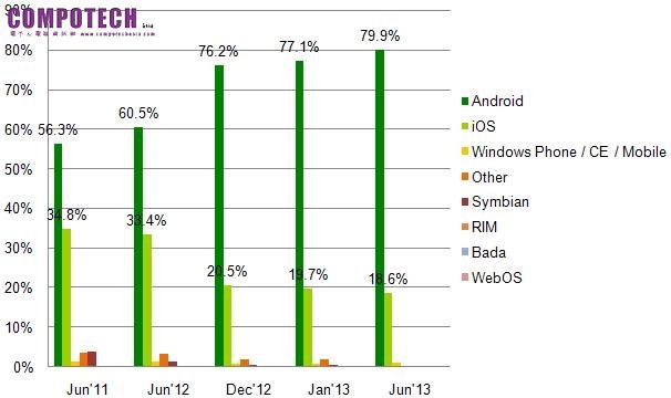 觀察2013年6月透過手機所瀏覽網頁的作業系統與廠牌分佈發現,iOS系統手機瀏覽網頁的比例佔整體的18.6%,使用Android系統佔79.9%。與2年前網頁瀏覽狀況相比,iOS瀏覽網頁佔比下滑16.2%,相對的Android增長顯著提升23.6%。在平板電腦方面,iOS瀏覽網頁佔71%,Android系統佔28.9%,iOS系統的平板裝置仍為主要。但是與2年前相比,iOS網頁瀏覽佔比下滑19.7%,Android則是提升19.7%。不論是手機或是平板電腦都可以發現iOS系統下滑、Android持續提升,可能因現今市面上有眾多品牌的裝置皆搭配Android作業系統。