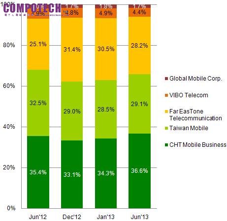 2012年6月-2013年6月行動上網瀏覽網頁以電信業者分佈