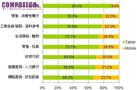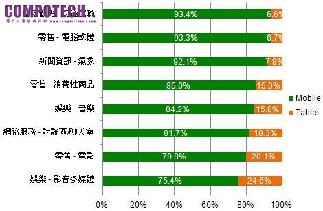 觀察使用不同裝置瀏覽的網頁內容,2013年6月透過手機瀏覽的網頁類型主要以平時外出時需要使用到的資訊如交通運輸、氣象等等,另外在瀏覽不同類型的娛樂內容也頗顯著。而使用平板裝置瀏覽的網頁內容與生活上的服務相關,包含汽機車資訊、工商名錄、政府行政、人力銀行、折扣訊息等等,且造訪不同零售資訊的狀況也高,顯示網友逐漸適應使用平板裝置進行購物。