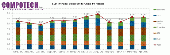 從2013年11月開始,LG Display對中國大陸廠商的供應策略尤為激進,但從2014年1月份開始,LG Display明顯下調了對中國本土廠商的出貨計畫,這主要與其他競爭者的策略加碼有關,尤其三星對於中國本土市場的加碼對其份額有所蠶食。