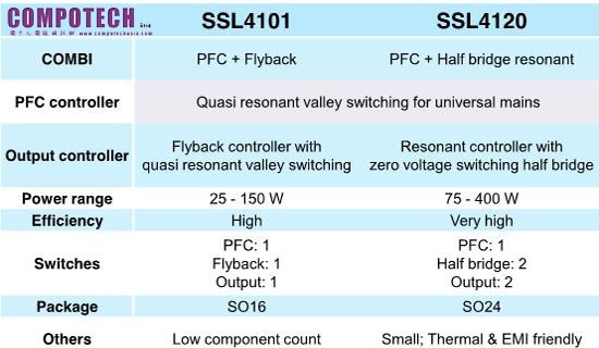 此次的解決方案中,SSL4101驅動IC採用Flyback 反激拓撲電路結構,適用於25W~150W之間的功率LED驅動電路;SSL4120驅動IC則採用使用LLC諧振拓撲電路結構,適用於75W~400W之間功率的LED驅動電路。兩者皆整合了PFC控制器。