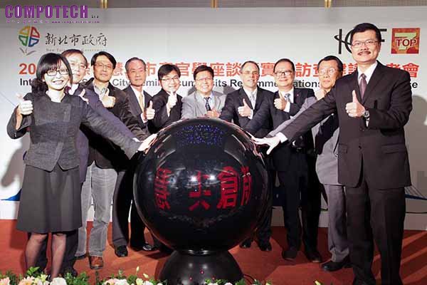 照片:新北市府團隊攜手產業夥伴共同展現新北市在寬頻連結、雲端運算與海量資料、產業創新與轉型、環境永續、雲端教學、文創產業及雲端效能政府的各項計畫與成果,全力爭取2014 年ICF智慧城市Top1的最高榮譽