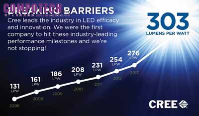 2014年3月27日--科銳公司 (Cree, Inc) (Nasdaq: CREE) 以每瓦達到303流明的白光高功率型LED,締造了LED產業的另一個重要里程碑。實現此一成就之迅速,遠遠超過業界以往所想可能的速度,這個結果也超越了科銳前一代研發的每瓦276流明的產業最佳紀錄,而兩項突破之間僅僅相隔一年。