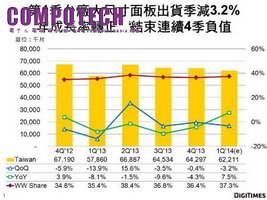 2014年4月21日--根據DIGITIMES Research調查,2014年第1季台廠大尺寸(9吋及以上) TFT LCD面板出貨量為6,221萬片,較2013年第4季僅減少3.2%,且較2013年第1季增加。此為2013年連續4季出貨量較前一年度衰退後,首次季出貨量年成長率轉為正值.