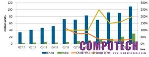 長率為163%,同期的中國為28%, DisplaySearch預估今年第三季印度智能手機年成長率將接近200%。雖然規