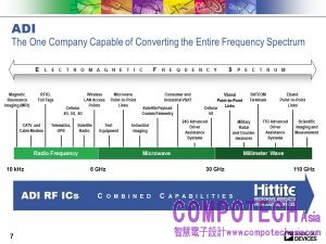 ADI亞太區業務暨行銷副總裁鄭永暉表示,基於客戶對於更高頻段解決方案的需求愈形顯現,ADI併購Hittite所專擅的6GHz-110GHz頻譜解決方案,讓ADI成為一家擁有業界全射頻頻譜轉換能力的公司,並且得以觸及新興的航太電子領域。ADI在微波與毫米波的應用如微波點對點、工業影像、衛星通訊、24G/77GHz 先進駕駛輔助系統、蜂巢式5G技術、Vband/Eband點對點連結甚至高階科學影像與量測應用都有卡位的機會。