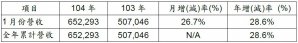 2015年2月6日--創意電子股份有限公司(股票代碼:3443) 今(6)日公佈民國104年1月份營業額為新台幣6億5仟2佰萬元。與上個月份營業額比較,增加26.7%。與去年同期營業額比較,增加28.6%。