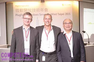 專題演講講者由左至右為微軟公司企業雲端部門軟體工程總監湯瑪士.芬寧博士 (Dr. Thomas Pfenning)、微軟公司企業雲端事業群合作夥伴暨客戶生態體系及體驗總經理克里斯.菲利浦 (Chris Phillips)、微軟總部軟體工程總監劉世勝。