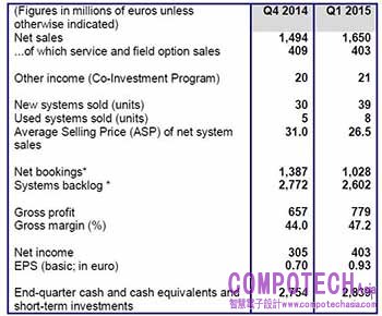 2015年4月16日--ASML總裁暨執行長溫彼得 (Peter Wennink) 表示,「我們2015年第一季的營收淨額符合預期,主要是因為DRAM記憶體客戶需求續強,且晶圓代工領域的銷售優於上一季。毛利率提高到47.2%。如同先前預期,2015年來自DRAM客戶的產品銷售額將維持健康穩定的狀態。另一方面,由於客戶對於我們的全方位微影(Holistic Lithography) 產品和系統升級服務的需求提高,預估我們的服務相關營收在未來幾季應該會持續成長。在EUV產品進度上,今年我們將會從光源功率和生產力兩方面,持續提升系統的穩定性和妥善率,並完成第四代機台 NXE:3350B的出貨。」