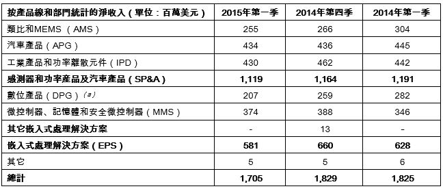 2015年第一季意法半導體各產品部門的季淨收入和營業利潤