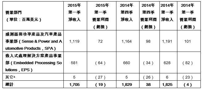 感測器和功率産品及汽車產品事業部第一季淨收入較去年同期減少6.0%,主要原因是類比、MEMS及感測器(AMS)銷售收入減少。感測器和功率産品及汽車產品事業部收入較上一季減少3.9%,主要原因是工業產品和功率離散元件(IPD)的PC電源晶片銷售下降。2015年第一季感測器和功率産品及汽車產品事業部營業利潤率,包括閒置產能支出,減少6.4%,而去年同期和上一季分別為8.5%和8.4%,主要原因是收入減少。