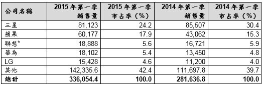 表一、2015年第一季全球智慧型手機終端銷售量,按廠商(單位:千支)