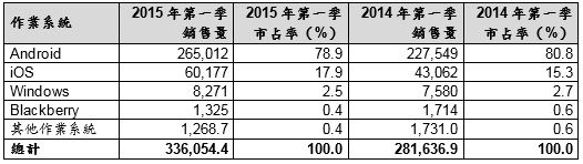 表二、2015年第一季全球智慧型手機終端銷售量,按作業系統(單位:千支)