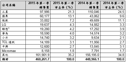 2015年第一季全球終端手機銷售量達4億6,030萬支,較2014年同期成長2.5%(參見表三)。Gupta表示:「在新興市場智慧型手機強勁銷售的帶動下,印度和中國的手機製造商在2015年第一季的版圖擴張,共有六家企業名列2015年第一季十大手機廠商。」