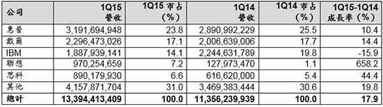 表一、2015年第一季全球伺服器廠商營收初步統計(單位:美元)