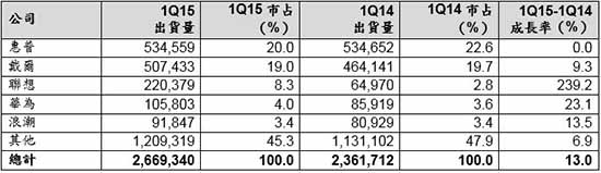 2015年第一季,單位出貨量成長最快的區域包括北美(22.9%)、中東非洲(20.8%)以及亞太地區(13.6%)。