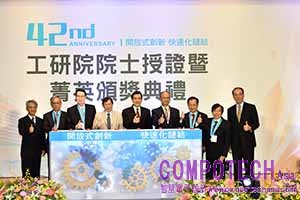 2015年7月3日--工研院今(3日)歡度42週年院慶,馬總統親臨祝賀並頒授第四屆工研院院士證章及證書給台積電董事長顧問蔣尚義、漢民微測科技執行長招允佳及儒鴻企業董事長洪鎮海、世界先進前任董事長章青駒。馬總統在授證典禮上送給工研院16個字「埋頭苦幹,不提預算,成果亮眼,人人按讚」,盼工研院繼續發揮跨業或跨領域的緊密合作與國際競速,協助政府實現「創新強國」。