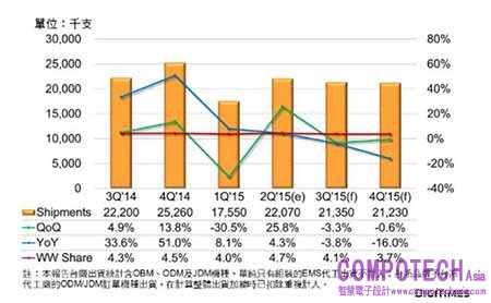 2015年8月5日--根據DIGITIMES Research訪查,2015年下半手機品牌業者中,華碩與宏碁出貨量將高於上半年水準,宏達電則難擺脫低潮;代工業者將面臨既有機款出貨衰退程度大過新訂單增幅的窘境。整體預估台廠將面臨下半年單季出貨低於第2季水準,第3、4季恐各僅2,135萬及2,123萬支。