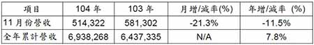 2015年12月7日--創意電子股份有限公司(股票代碼:3443) 今(7)日公佈民國104 年11 月份營業額為新台幣5 億1 仟4 佰萬元。與上個月份營業額比較,減少 21.3%。與去年同期營業額比較,下滑11.5%;全年累計營收為新台幣69 億3 仟8 佰萬元,較去年同期增加7.8%。
