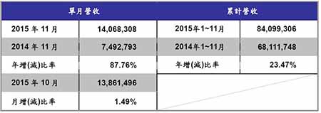 累計2015年1至11月合併營收為新台幣840.99億元,較去年同期增加23.47%。