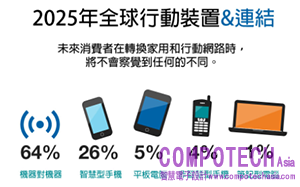 超過400億的裝置將與網路連結,且全球大部分的IP流量將來自於非PC裝置。在這些連網裝置當中,有64%是用於機器與機器(M2M)之間的資料交換,26%來自於智慧型手機,5%來自平板,4%來自功能型手機,而剩下的1%則來自筆電。