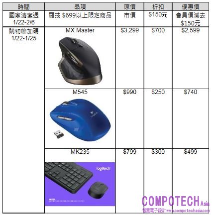 此外於燦坤購物節期間(1月22日至1月25日),羅技更加碼3款明星商品,祭出最高近6折下殺優惠,包含為專業品味人士打造的旗艦級無線滑鼠MX Master,原價$3,299元,現金折價$700元,限量100個;全新簡約的無線鍵盤組MK235,原價$799元,折價$300元;小巧好攜帶的時尚酷炫滑鼠M545 原價$990元,折價$250元。限時限量的獨家好康優惠,讓消費者輕鬆換新零負擔,愈早「購」愈划算!