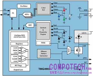 TMx4903新的3D手勢和接近感測功能透過紅外線LED時脈和輸出功率可實現自動調整,減少噪音和功耗,同時強化靈敏度和動態範圍。TMx4903包含創新的電路技術,可免於環境光的干擾。自動校準功能免除電子噪音和光學串擾。整合的智慧LED驅動功能讓它能夠不需透過應用處理器來控制LED驅動功能,大大減低了手機軟體的負擔,減少瞬間手勢識別所需要的運算能力。