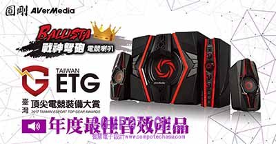 2017年01月20日--圓剛科技自2016年推出戰神弩砲電競喇叭以來,不斷獲得海內外市場的肯定,今年度更參與「2017 ETG台灣頂尖電競裝備大賞」,獲得年度最佳音效產品獎。此獎項將於本月20號登場的台北國際電玩展當天進行頒獎典禮。此外,大會更於為期5天的電玩展現場設立ETG櫥窗區及體驗區,展示所有得獎產品,歡迎所有人到現場進行產品體驗。