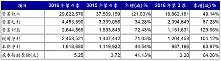 GIS 2016 年第 4 季營業收入為新台幣 296 億 2 仟 3 佰萬元,本期稅後淨利為 16 億 1 仟 9 佰萬 元;基本每股盈餘為新台幣 5.25 元。