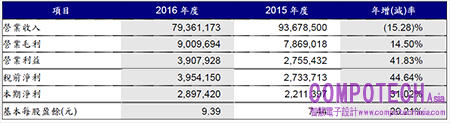 2016 年全年營業收入為新台幣 793 億 6 仟 1 佰萬元,本期稅後淨利為新台幣 28 億 9 仟 7 佰萬 元;基本每股盈餘為新台幣 9.39 元。
