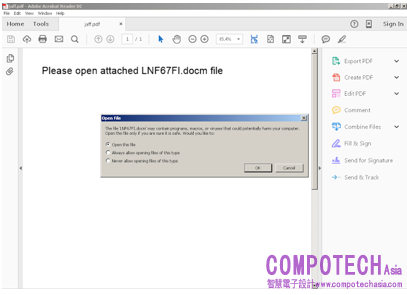在所有情況中,附件文件都是一個惡意PDF文檔,內嵌了Microsoft Word文檔。當受害者打開PDF時,在PDF正文中將會顯示一段內容,然後試圖打開內嵌的Microsoft Word文檔。