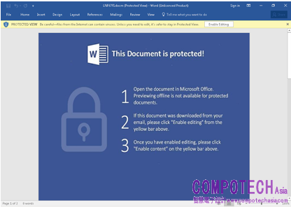 單擊“OK(確定)”按鈕會導致PDF打開惡意Microsoft Word文檔,整個行為與我們在其他攻擊活動中看到的行為基本類似。毫無意外的是,用戶還將會被提示啟用編輯,以查看Word文檔的內容。需要指出的是,該惡意Microsoft Word文檔包含兩頁,而不像大多數惡意Word文檔一樣只有一頁。