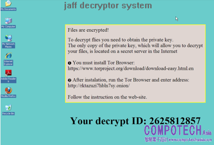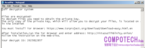 勒索軟體會重複對系統上存儲的文件夾進行加密,這一特定勒索軟體附加到每個文件的文件擴展名為“jaff”。它會在受害者的“My Documents(我的文檔)”目錄下寫入一個名為ReadMe.txt的文件,其中包含了勒索聲明。