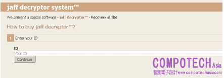 需要指出的有趣一點是,上面的說明並未指示用戶使用Tor2Web等Tor代理服務,相反它指示用戶安裝整個Tor瀏覽器軟體包,以訪問贖金付費系統。樣本和攻擊活動中使用的Tor地址也似乎沒有變化。訪問贖金付費系統時,受害者將會看到以下信息,要求他們輸入在被感染系統上的勒索聲明中列出的解密ID。