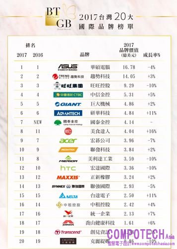 由經濟部工業局主辦,財團法人台灣經濟研究院委託全球權威品牌價值調查機構Interbrand鑑價的「2017年台灣國際品牌價值」在今(21)日公布榜單,華碩締造出蟬連五屆奪冠的傲人紀錄,而今年新進榜的國泰金控一舉擠進第七名。與去年相比,品牌價值進步幅度最大的美食達人(85°C)增幅達到16%。