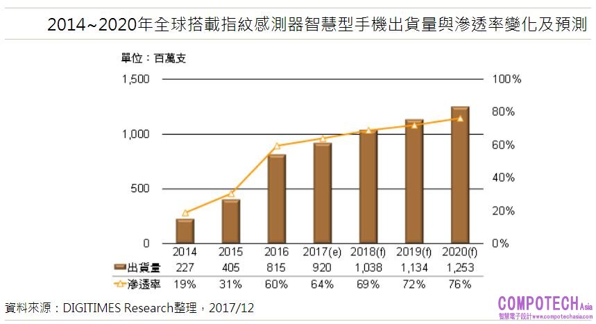 DIGITIMES Research觀察,指紋辨識已經成為中、高階智慧型手機基本配備,2017年儘管蘋果(Apple)旗艦機種iPhone X未採用指紋感測器(fingerprint sensor),改用人臉辨識方式,但全球配有指紋感測器的智慧型手機出貨量仍達9.2億支,滲透率約64%,預估隨智慧型手機出貨量逐年成長及行動支付等需求升溫,2020年搭載指紋感測器智慧型手機出貨量可達12.5億支,滲透率將超越75%。