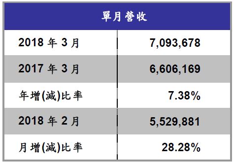 2018 年 3 月份營收報告  (單位: 新台幣仟元)